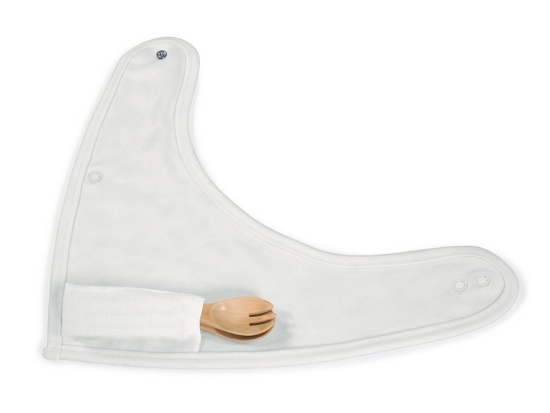 Podbradník: Součástí soupravy je podbradník, který slouží i jako cestovní pouzdro. Je vyroben ze 100% organické bavlny, je velmi měkký a jemný k dětské pokožce. Díky vnitřnímu kapsičce a zapínání na patent se do něj dají hygienicky zabalit příbory.